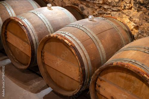 Wine cellar with wooden barrels in old wine domain on Sauternes vineyards in Barsac village affected by Botrytis cinerea noble rot, making of sweet dessert Sauternes wines in Bordeaux, France