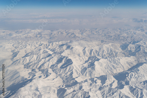 Wing of aerial view of an airplane jet flying above clouds from the window in traveling and transportation concept. White snow mountain in winter season. Nature landscape background.