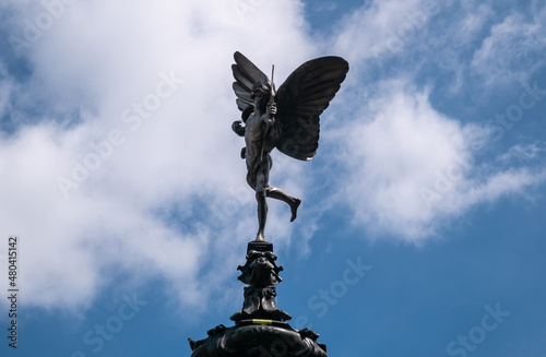 Winged statue of Anteros at the Shaftesbury Memorial Fountain (Eros), by artist Alfred Gilbert. Piccadilly Circus in London, England, United Kingdom.