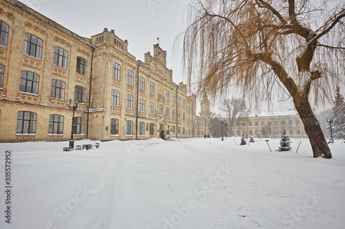 Winter city landscape. Winter park covered with snow.
