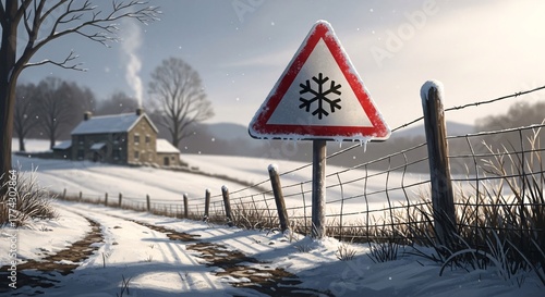 winter, countryside, warning, signs, snowfall, landscape, weather, season, cold, ice, frost, glacé, snow, white, precipitation, nature, scenic, rural, road, path, track, farmhouse, house, building, bungalow, home, atmosphere, serene, peaceful, tranquil, quiet, calm, wintery, scene, view, outdoors, environment, natural, element, symbol, alert, hazard, danger, information