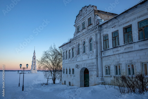 winter, bell tower, house, russia, city, town, street, historical, center, building, old, luxury home, bell, tower, belfry, st, saint nicholas, flooded, architecture, embankment, dawn, classicism, landmark, religious, religion, christianity, orthodox, reservoir, view, landscape, urban, city landscape, jan, morning, travel