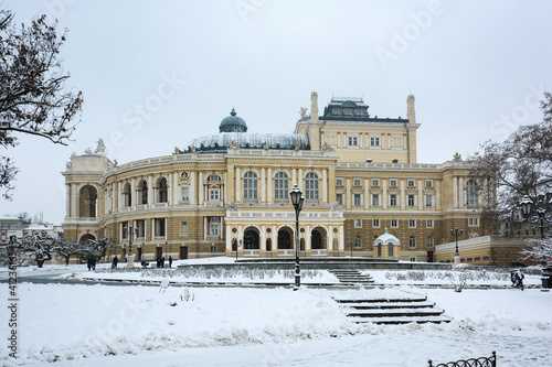 Winter day in Odessa. Snowy, cold weather. Odessa National Academic Theater of Opera and Ballet, architectural monument, Ukraine.