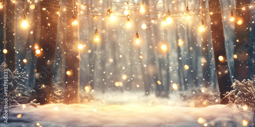 Winter forest background with fluffy snow and glowing lights for festive presentations