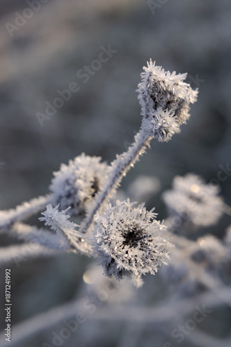 Winter frost on dead flowers and grass.