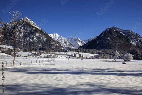 Winter landscape in the snow, mountains of the Allgäu Alps in the background, Oberstdorf, Oberallgäu, Allgäu, Bavaria, Germany