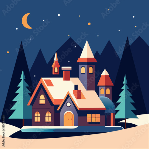 house, christmas, winter, vector, cartoon, town, snow, illustration, castle, building, home, city, village, architecture, night, tree, christmas, holiday, scene, landscape, sky, bungalow, tower, window, design