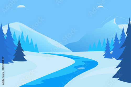 Winter landscape with river and mountain background