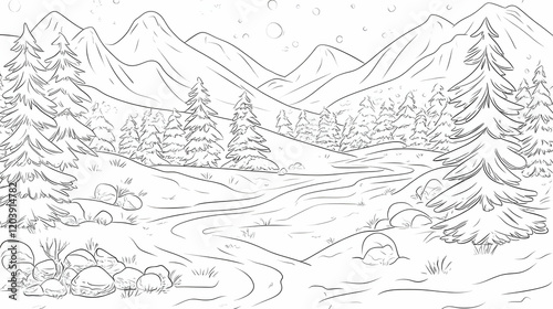 mountain, stream, winter, snowy, landscape, nature, colouring, page, children, activity, book, snow, mountain, tree, forest, river, peaceful, scenic, background, illustration, art, design, image, graphic, vector, drawing, winter landscape, scene, cold, serene, tranquil, quiet, white, black, line, vignetting, frost, hill, vale