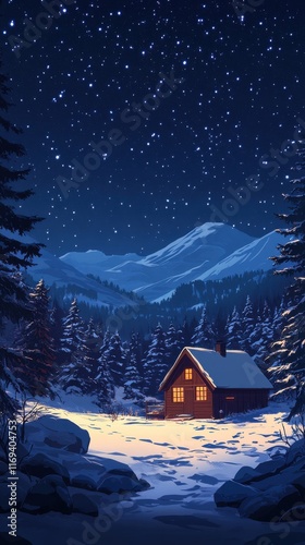 Winter night scene with a cozy cabin illuminated by warm light surrounded by snow-covered trees and mountains under a starry sky