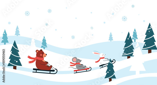 Winter scene with cute bear, mouse, and rabbit characters riding sleds down a snowy hill among evergreen trees and snowflakes.