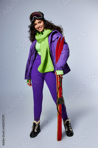 winter sports, brunette, woman, curly hair, posing, activewear, cheerful, ski, grey background, happy, smile, purple, green, young, trend, style, fashionable, foulard, blue eye, natural makeup, beauty, winter, caucasian, warm, attractive, fashion, outfit, seasonal, lifestyle, recreation, leisure, studio, exercise, vacation, holiday, travel, adventure, cold, frosty, active, modern, cold weather, boot, key