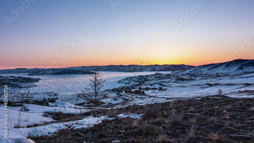 Winter sunrise in Siberia. The sky above the mountains is pink and orange. Glare of the sun on the ice of a frozen lake. Village houses on the shore. Snow and dry grass on the ground. Baikal