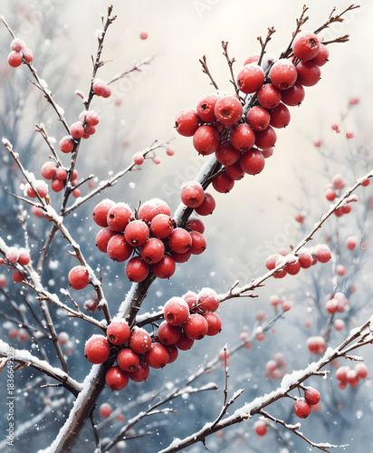 watercolor, frost, branch, red berry, seasonal, nature, snowy, cold, winter, botanical, christmas, holiday, natural, festive, delicate