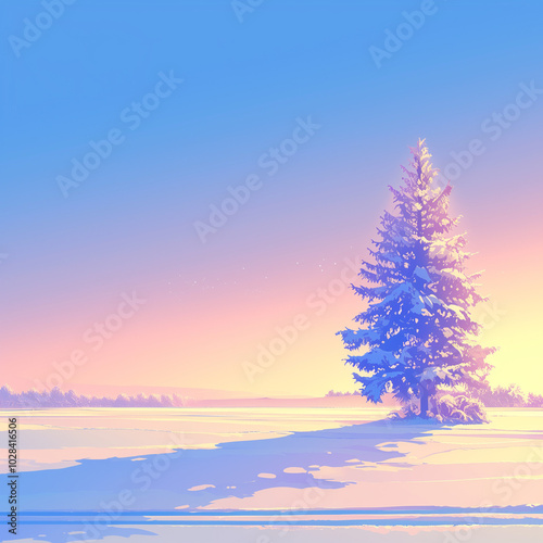Winter’s Glow: A Festive Tree in the Golden Light of Dawn. Merry Christmas and Happy New Year. Background for Christmas card and background design.