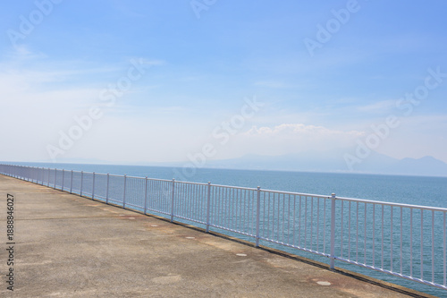 青空を背景に 「潮風が運ぶ、防波堤から見える海と遊歩道」 宇土市観光スポット(宇土マリーナおこしき館) With a blue sky as a backdrop "The sea and promenade seen from the breakwater, carried by the sea breeze" Uto City Tourist Spot (Uto Marina Okoshiki