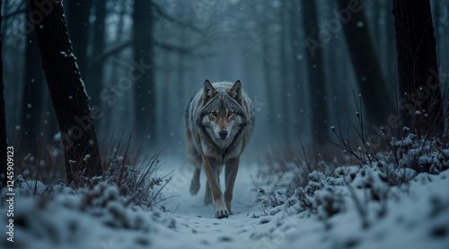 Wolf walking through a snowy forest during twilight, surrounded by fog and dark trees