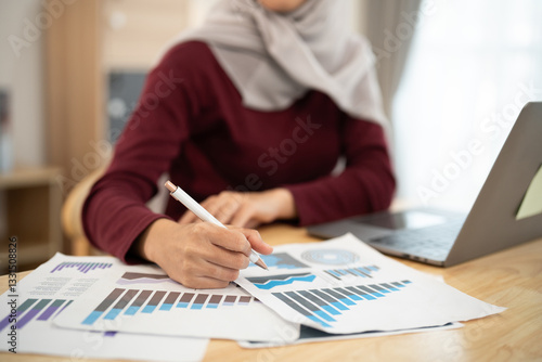 woman, datum, analysis, chart, graph, office, laptop, workspace, document, pen, paper, statistic, presentation, technology, professional, finger, writing, casual attire, business, feminine, digital, economic, information, research, study, modern, indoor, design, creative, sharpened, performance, table, education, plan, strategy, trend, workflow, productivity, task, culture, personal, career, work, home, environment