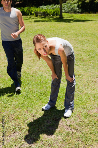 Woman bending over while a man is jogging behind her