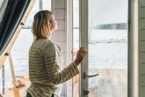 woman, breathing, fresh, air, glasses, door, home, 1, people, adult, day, leisure, country, house, residential, building, living, room, interior, casual attire, morning, standing, freshness, freedom, mindfulness, serene, mid, caucasian, lifestyle, transparent, inhaling, escapism, opening, female