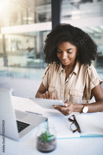 Woman, browsing and tablet in office for business, working and planning schedule on digital app. Communication, email and employee in creative agency, online and company website with professional