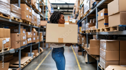 Woman Carrying Cardboard Box in Warehouse Setting Amidst Organized Shelves of Packed Goods and Products in Industrial Space