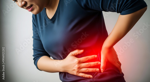 Woman clutching side in pain with red highlight on lower back ache discomfort
