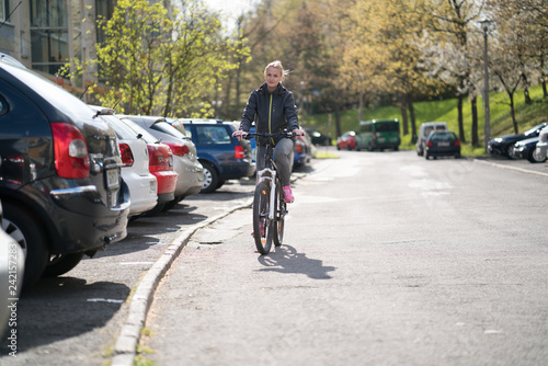 bicycle, city, young, lifestyle, woman, person, car, street, active, bike, bicyclist, nature, girl, female, biking, people, urban, transportation, ride, cycle, healthy, happy, building, outside, background, light, sport, beautiful