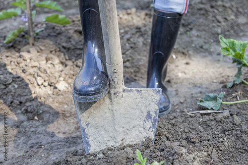 gardening, garden, greenhouse, dig, work, shovel, woman, dirtied, boot, black, spade, handle, metal, rubber, wellington, wet, muddy, mud, earth, horizontal, outside, people, female, cropped, lifestyle, one person, person, copy space, outdoors