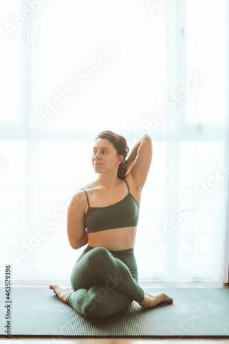 woman, morning, yoga, sport, recreation, lifestyle, copy space, free space, caucasian, adult, home, cover, health, woman, female, self-improvement, improvement, person, fitness, people, fit, female, wellness, training, exercise, physical exercise, healthy, position, pilates, pose, activity, class, asana, indoor, house, active, background, hand, well-being, mat, relaxation, young, meditating, floor, activity, vitality