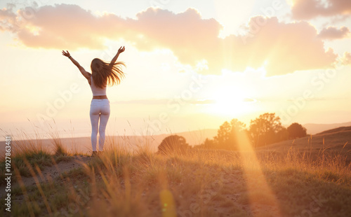 summer, sky, sunset, sun, nature, woman, people, silhouette, girl, lifestyle, sunlight, young, female, freedom, sunrise, happy, joy, celebration, backview, golden hour, warm, glowing, peaceful, inspirational, hopeful, energetic, carefree, outdoors, field, hill, grass, tree, horizon, cloud, orange, pink, purple, beauty, wellness, empowerment, adventure, travel, exploration, dreamy, romantic, emotional, uplifting