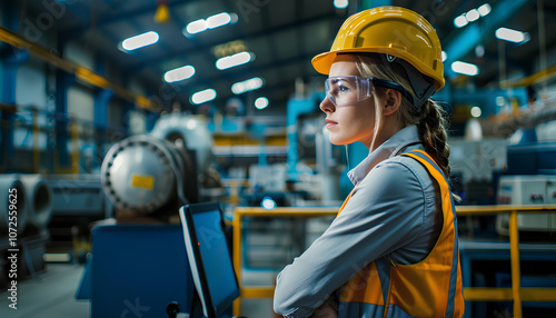 woman engineer standing confident concept, woman are engineer factory inspecting machine in factory with computer, woman engineer working in factory, woman confident