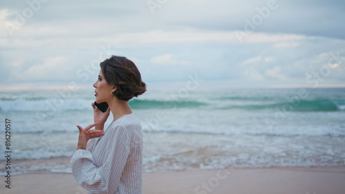 Woman enjoying cellphone conversation at ocean waves. Calm model stepping beach