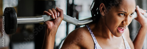 Woman exercising weighlifting with barbell at fitness gym
