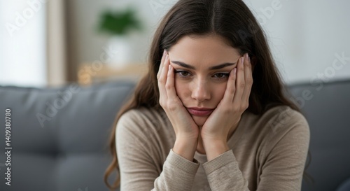 Woman expressing sadness while sitting on a couch in a living room