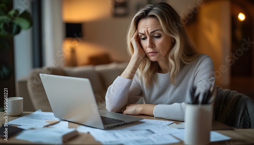 woman, blond, hair, face, hand, laptop, computer, desk, table, paper, bill, document, stress, overwhelmed, sleepy, worried, frustrated, concerned, home, living room, couch, hot drink, mug, cup, pen, crayons, holder, white, grey, sweater, shirt, light, shadow, indoor, domestic, office, work, job, finance, debt, financial, anxiety, depression, emotion, feeling, expression