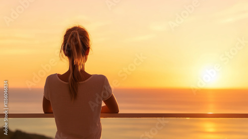 Woman finding peace and tranquility while basking in the golden sunset from a balcony overlooking the sea
