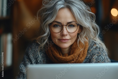 woman, laptop, cosy, evening, grey hair, goggles, sweater, sharpened, indoor, warm, concentration, writing, technology, home, casual attire, lighting, creativity, working, lifestyle, relaxation, content, study, reading, accessory, facial expression, stylish, soft light, knitted, hobby, productivity, leisure, age, modern, furniture, atmosphere, digital, communication, pensive, intelligence, womanhood, feminine, calm, comfort, portrait, education, engagement