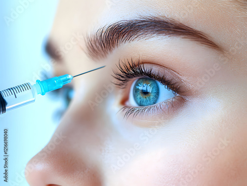 Woman getting cosmetic injection of botox near eyes. A Girl Undergoes a Temple Injection Procedure Showcasing an Intense Expression and Focused Attention in a Clinical Setting