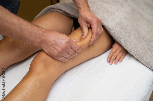 Woman getting legs lymphatic drainage massage in spa salon. Closeup. Body relaxation beauty and body care concept.