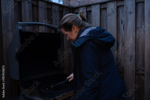 woman, grilling, bar-b-q, night, backyard, fence, food, tongs, cooking, jacket, evening, charcoal, grill, smoke, metal, wooden, dark, casual attire, standing, kitchen utensile, utensil, preparation, leisure, summer, meal, equipment, lighting, shadow, warmth, home, residential, lifestyle, dining, summer evening, culinary, food preparation, avocation, cosy, domestic, evening light, home cooking