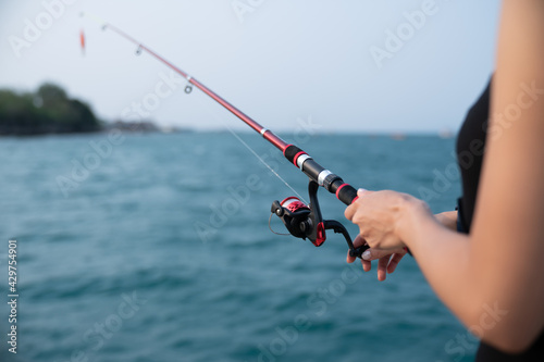 rod, hook, fisherman, equipment, cable, activity, angler, background, beach, beautiful, catch, colours, environment, female, fish, fishing gear, fishing line, fishing pole, hand, hobby, hobby, holding, hunter, lake, landscape, leisure, ocean, outdoors, outside, recreation, relaxation, river, sea, ocean life, seafood, sport, sportfishing, travel, vacation, water, woman