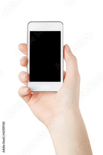 Woman hand holding smartphone on white, clipping path included