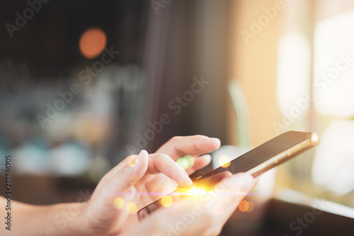 Woman hand using smart phone on old wood table texture background at coffee shop.