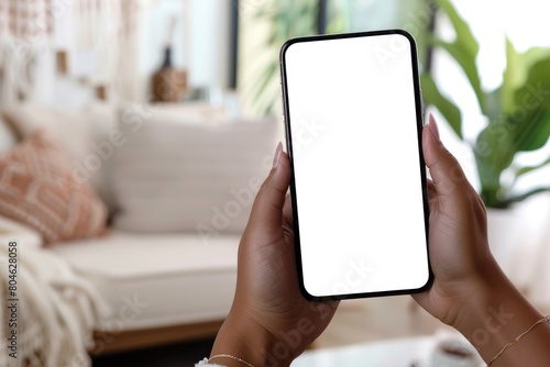 Woman hands holding cell phone with mockup white blank display.