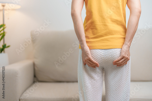 Woman having Abdominal pain. Hemorrhoids disease Constipation, Colorectal cancer. Digestive system, Health care and medical concept