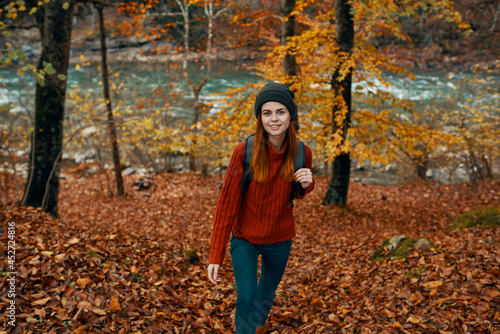 woman hiker travel forest autumn walk active leisure