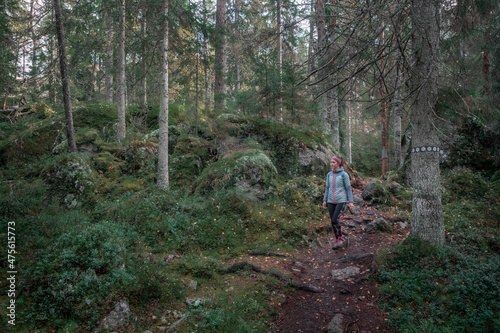 Woman hiking along footpath in the forest in Tiveden National Park in Sweden.