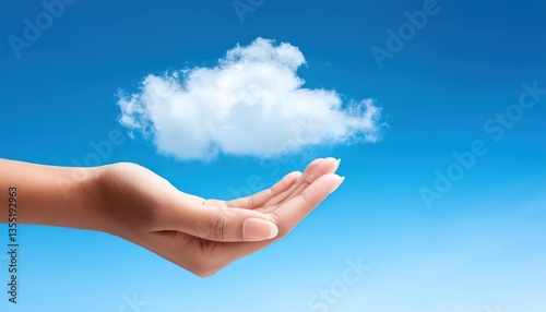 Woman Holding Cloud in Hands Symbolic Concept of Natural Care on a Blue Sky Background