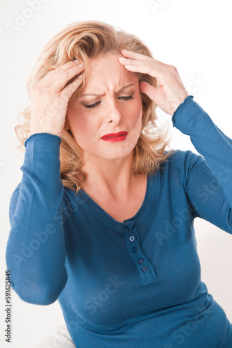 female, woman, caucasian, colours, human, alone, medicine, individual, image, front, portrait, to sit, casual attire, interior, cephalalgia, mature, person, medicals, frontal, teal, picture, 1, photograph, bruised, humanity, agony, fair-haired, affliction, studio shot, 40, white background, white, studio, adult, indoor, top, color image, aching, adults only, t-shirt, waist up, mature woman